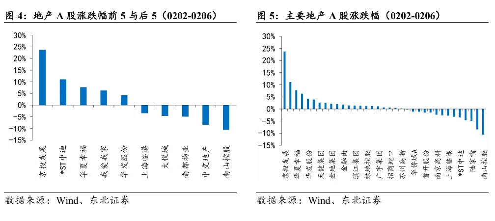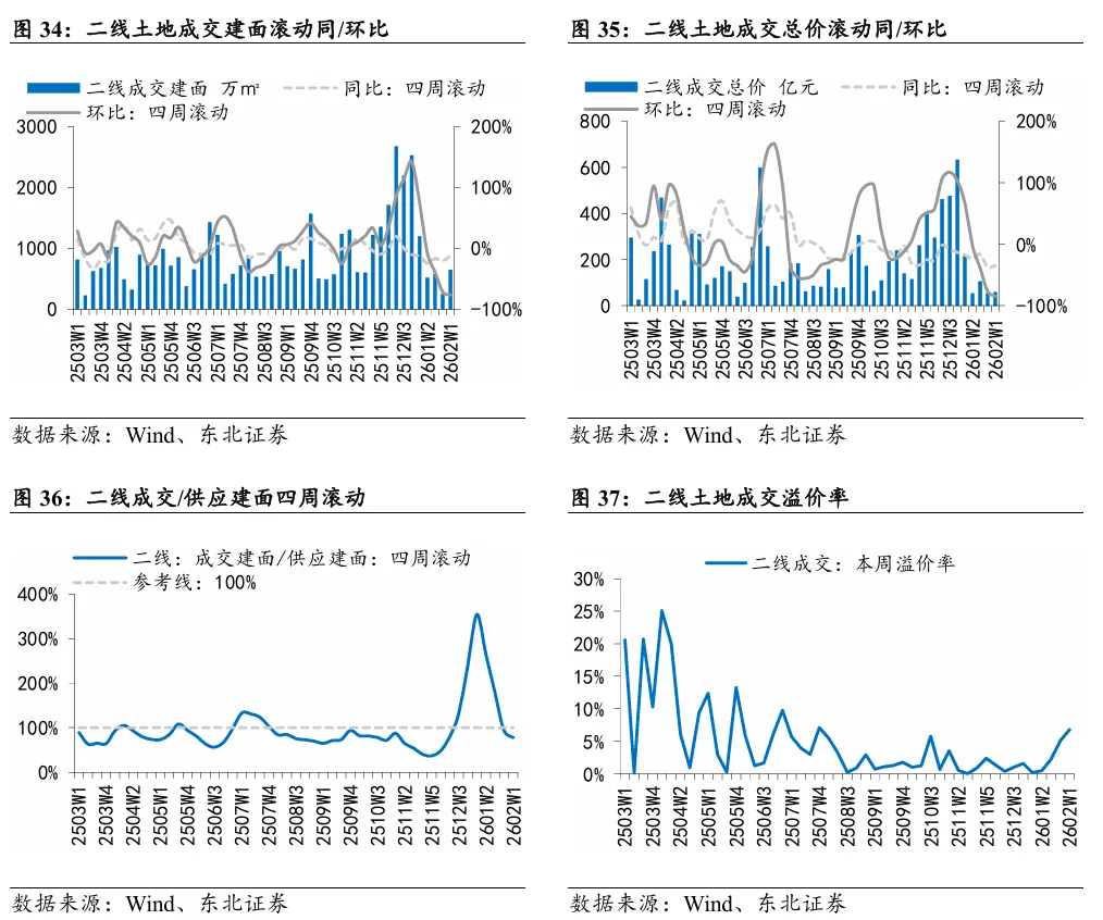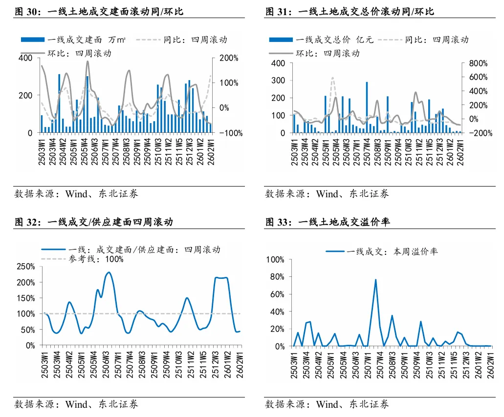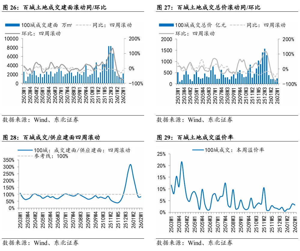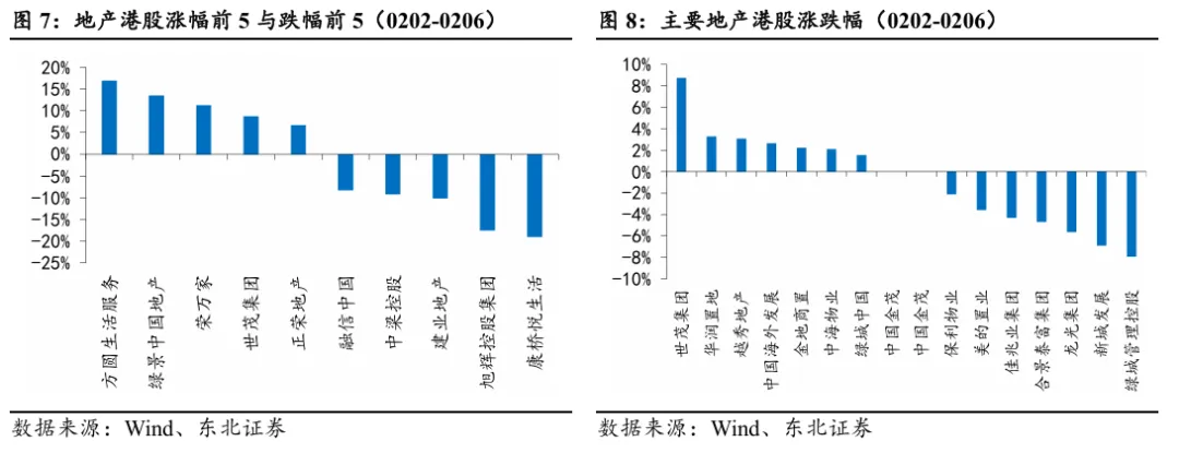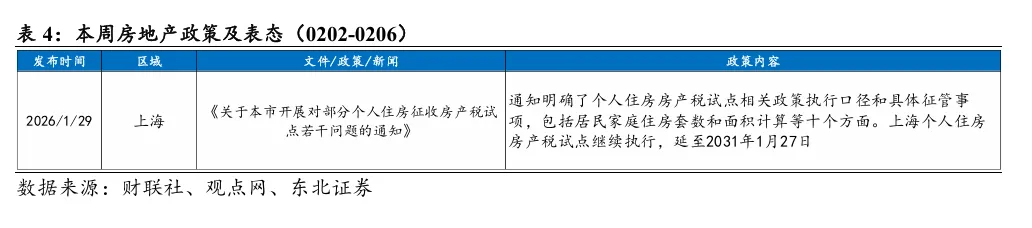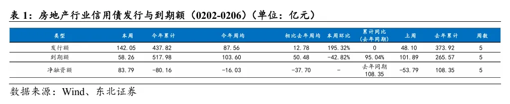 本周A股房地产和港股地产建筑板块涨跌幅分别为0.01%和-0.14%,分别跑赢大盘1.34pct/跑赢大盘2.88pct。本周地产信用债发行142.05亿元,净融资额83.79亿元。截至2026年2月6日,地产信用债累计发行437.82亿元,净融资额-80.16亿元,去年同期为108.35亿元。