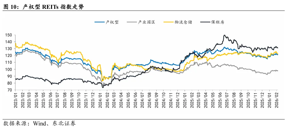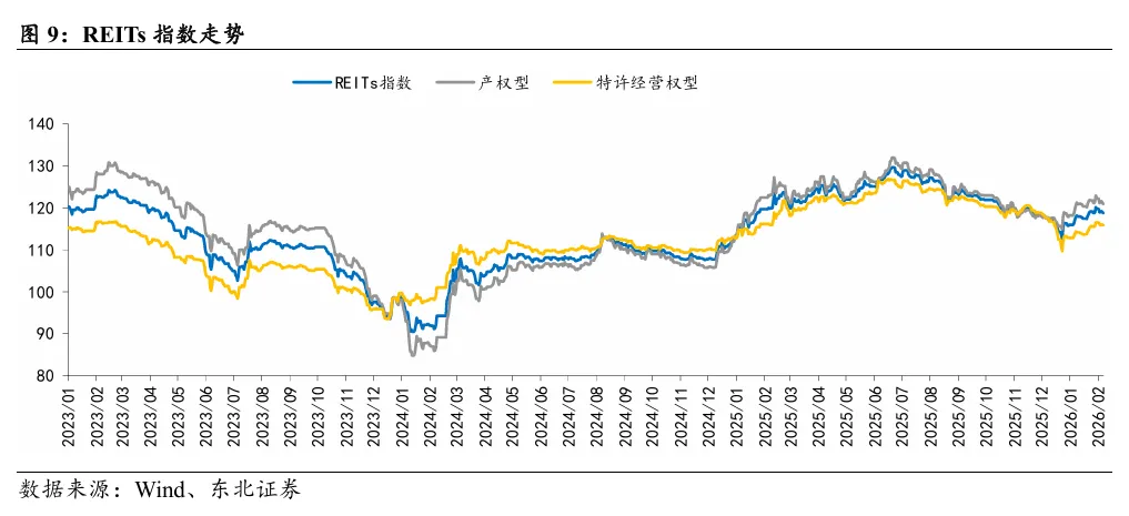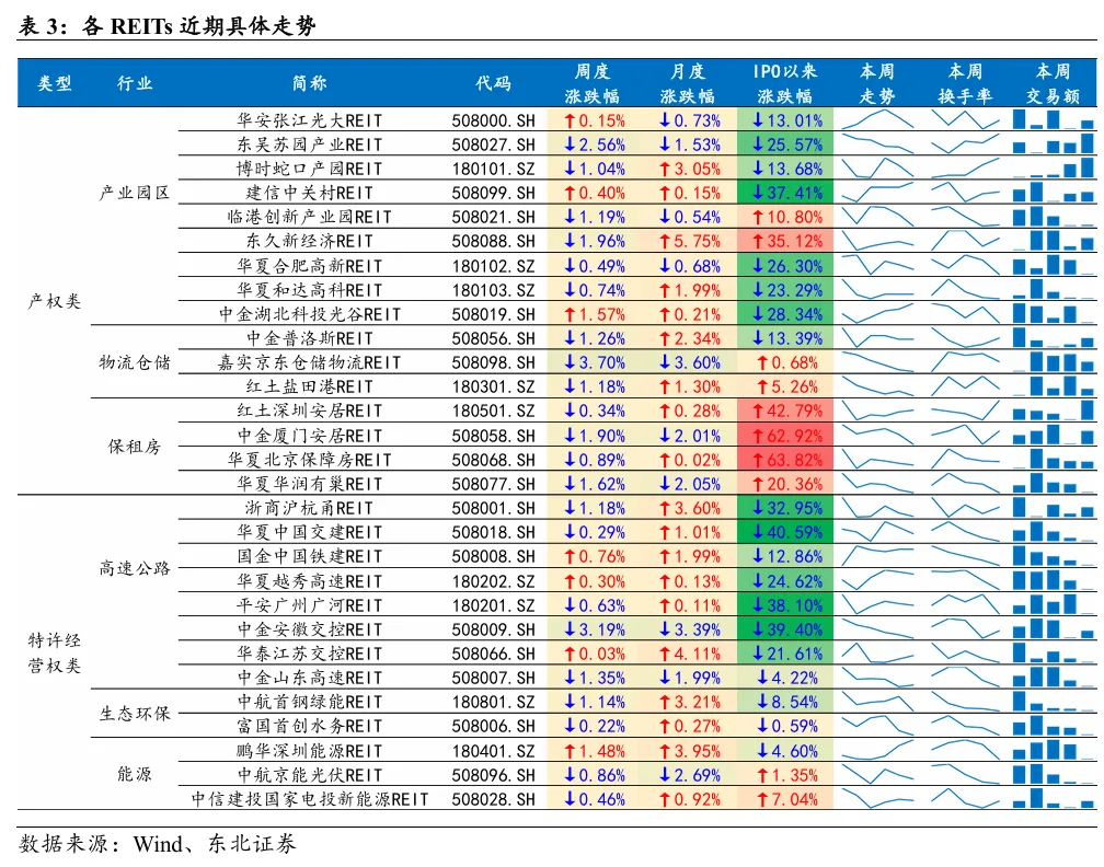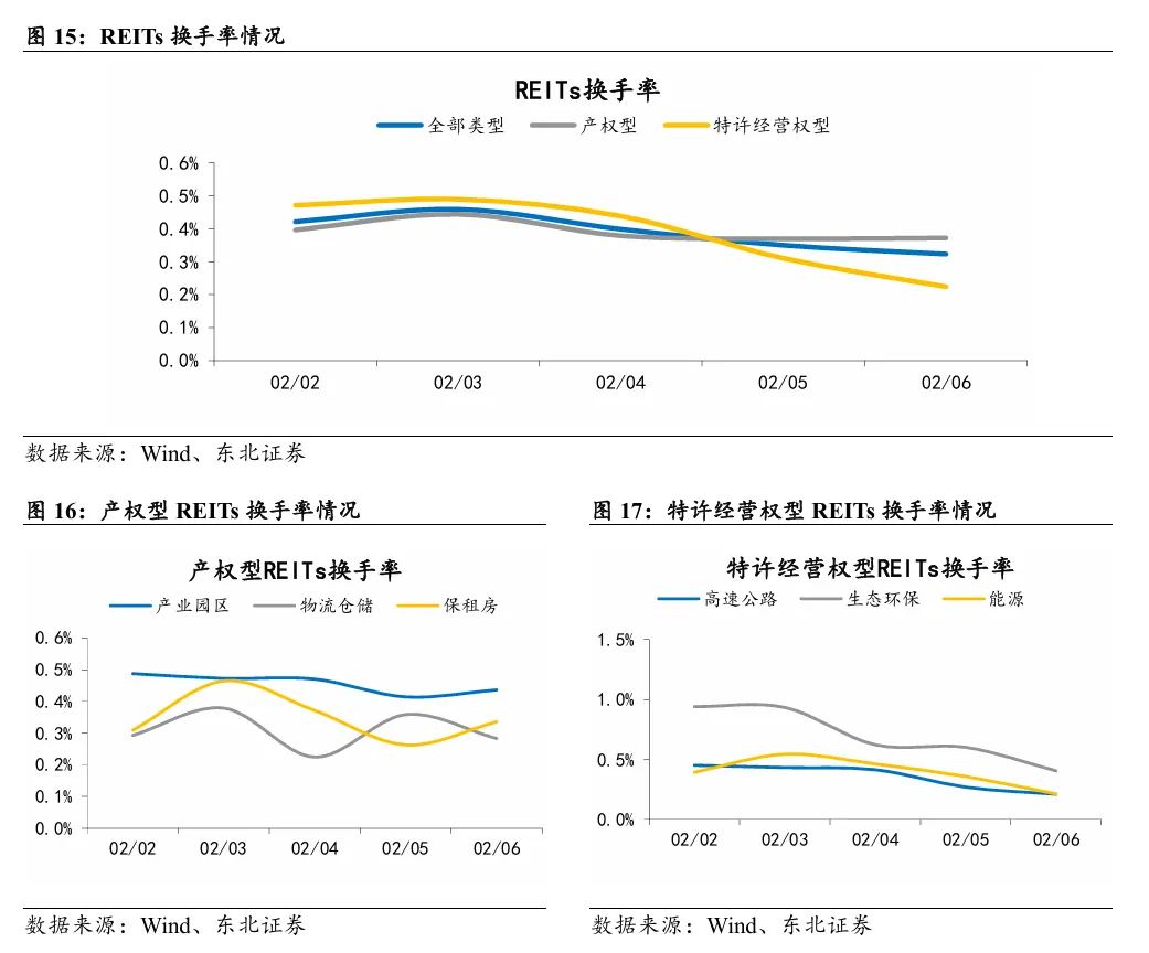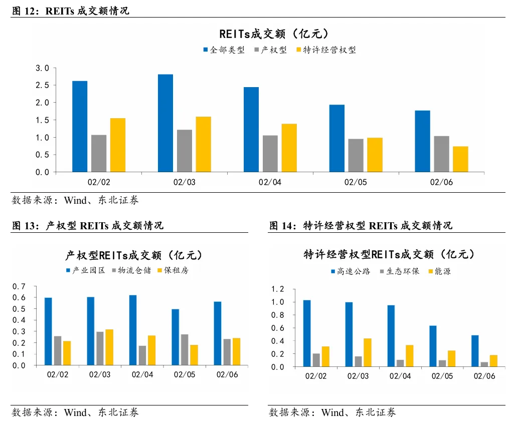 本周产权型REITs指数收于120.96点,涨跌幅为-1.05%;本周特许经营权型REITs指数收于115.89点,涨跌幅为-0.52%;近一个月,REITs指数跑赢沪深300指数3.56pcts,本周领涨或跌幅最小的公募REITs为中金湖北科投光谷REIT,涨跌幅为1.57%。本周REITs成交额为11.57亿元,环比-20.35%。本周REITs换手率为0.40%,环比-0.13pcts。