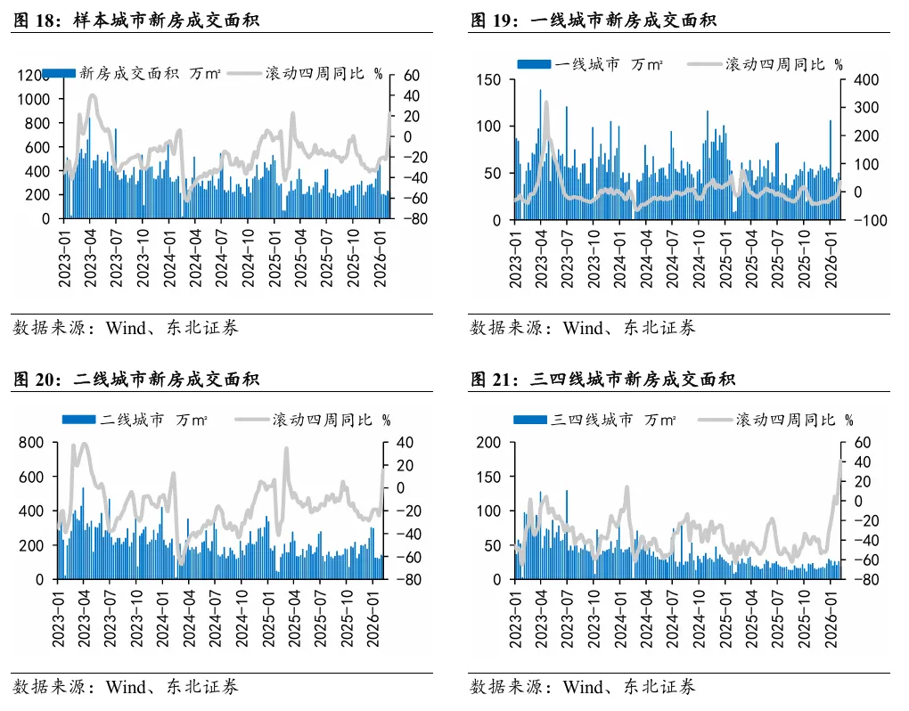 本周新房和二手房成交面积滚动四周同比分别+22.43%/+65.54%,累计同比分别-28.88%/+11.01%。新房端,45城商品房共计成交218万㎡,一/二/三四线城市滚动四周同比分别+35.11%、+15.44%、+40.93%。二手房端,14城二手商品房共计成交170万㎡,一/二/三四线城市滚动四周同比分别+93.60%、+55.68%、+158.47%。