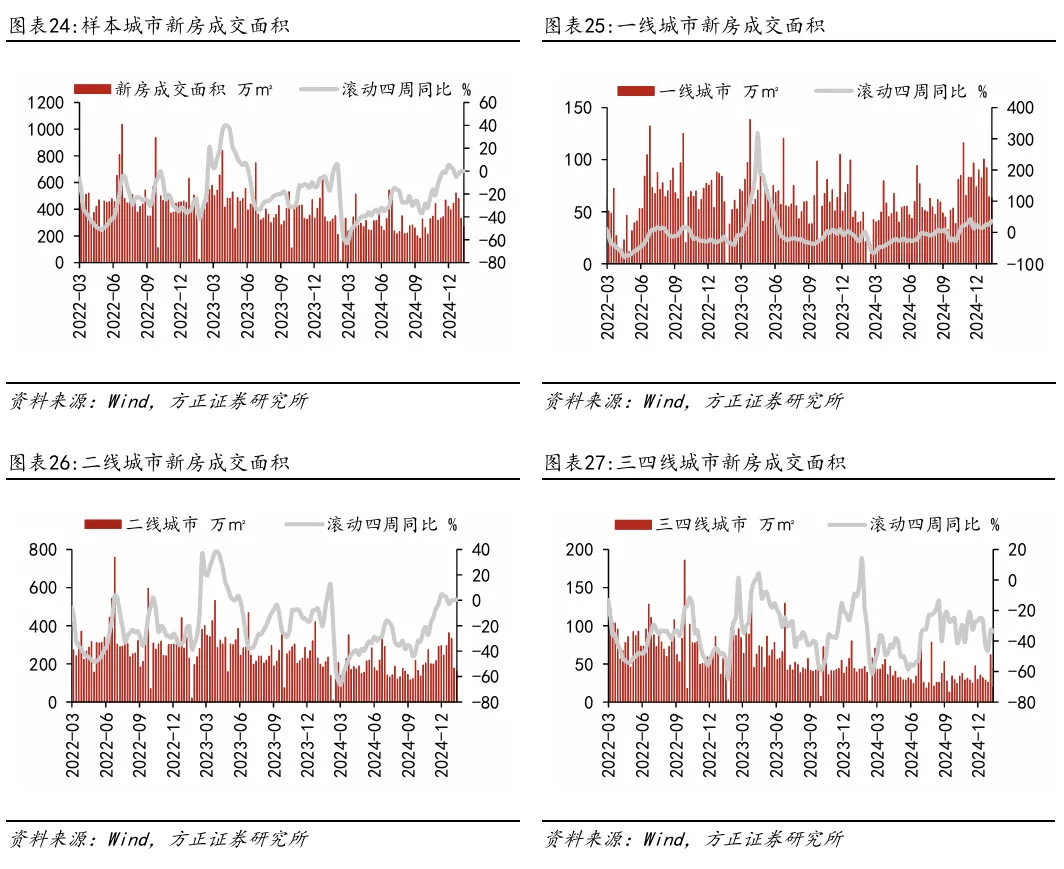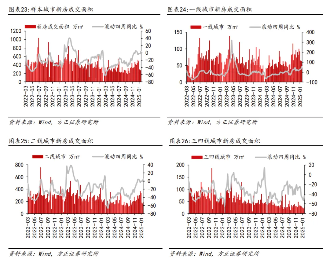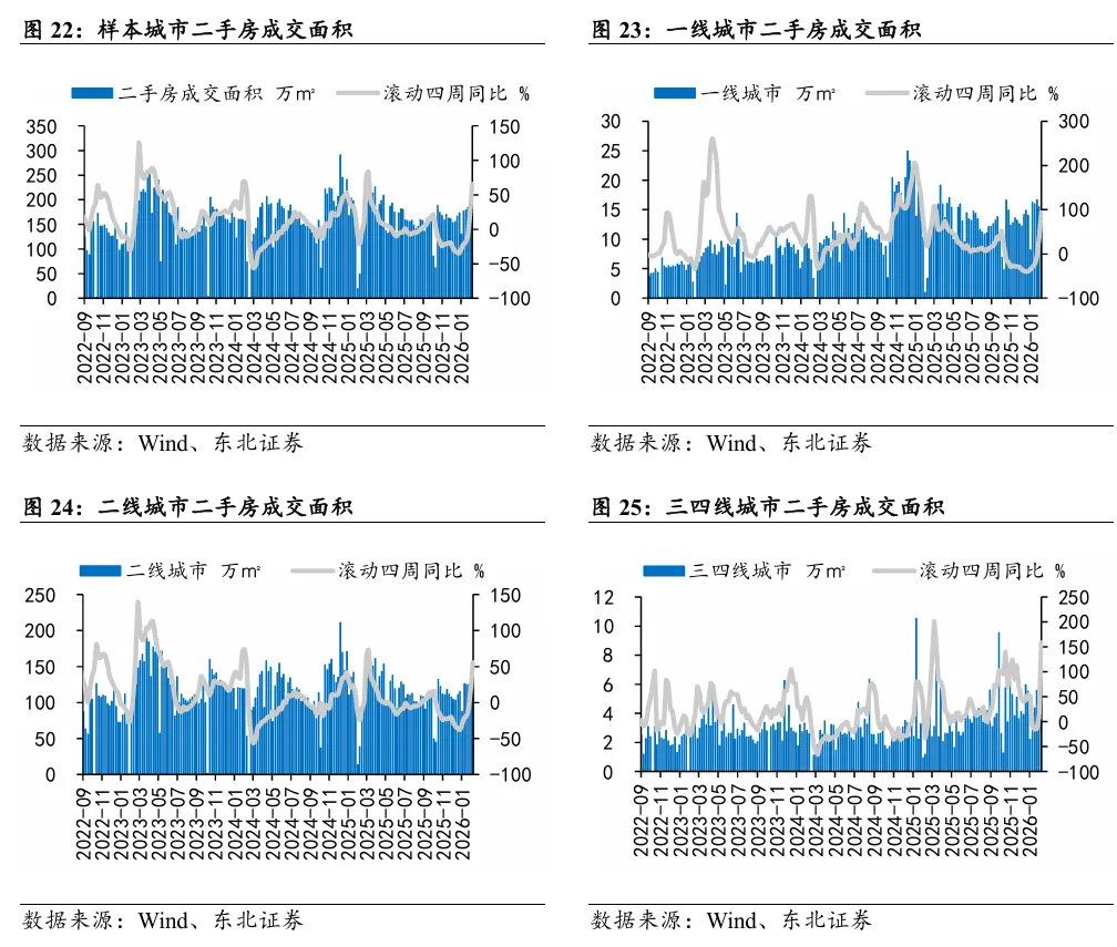 本周新房和二手房成交面积滚动四周同比分别+22.43%/+65.54%