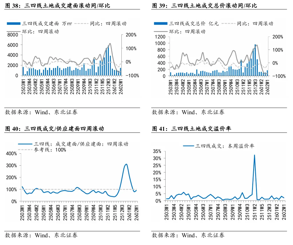 本周百城供应和成交建面环比+1.40%/-73.67%,溢价率+3.12%,一线供应和成交建面环比+75.52%/-63.92%,溢价率0.00%,二线供应和成交建面环比+4.03%/-77.08%,溢价率+6.77%,三四线供应和成交建面环比-5.62%/-72.40%,溢价率+2.04%。