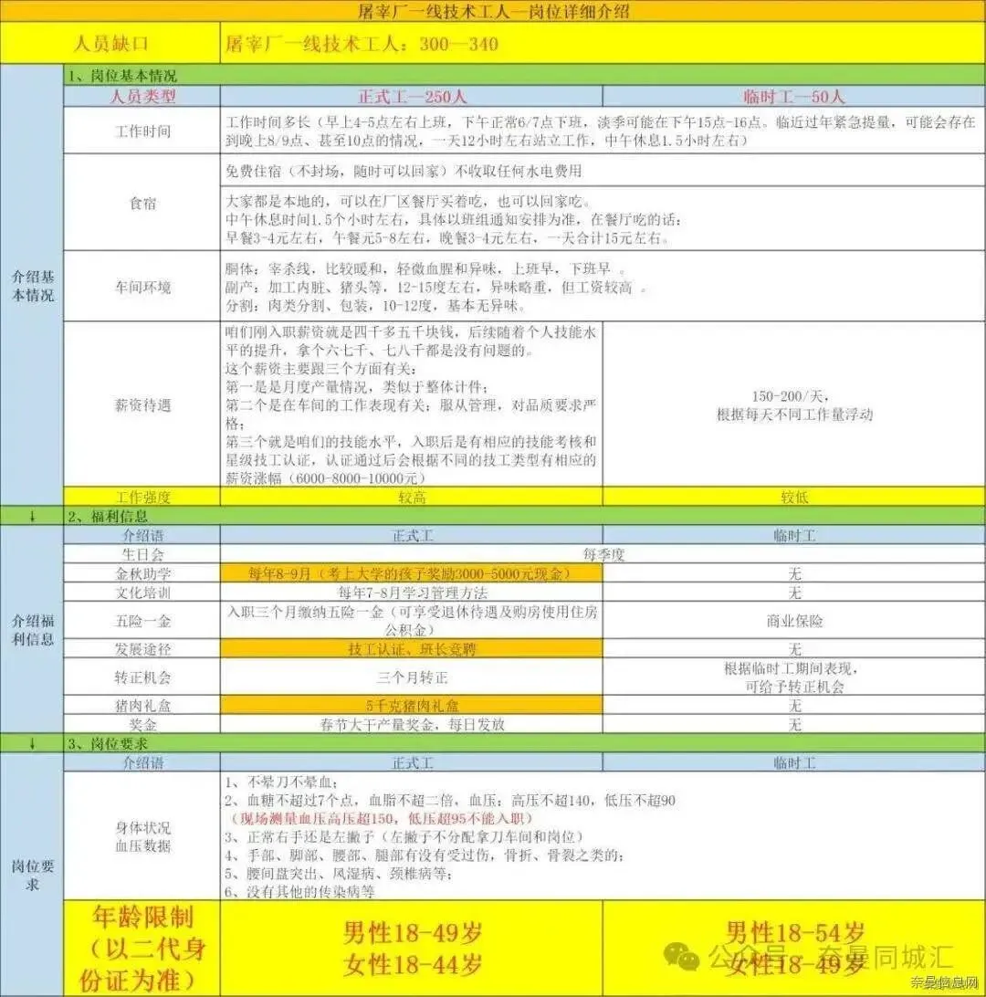 公司:奈曼旗牧原肉食品生产有限公司工作内容:猪肉屠宰,生产工人(工厂直招)联系人:薛睿 166****0332(找工作打电话/加微信)详情工作岗位、福利待遇及薪资发放查看图解胴体缺口19人,薪酬7-12K,刺杀放血岗位认证通过日薪**400+元副产缺口50人,薪酬6-12K,翻大肠岗位认证通过日薪**400+元分割缺口46人,薪酬6-12K,扒膘、修整岗位认证通过日薪**400+元包装缺口22人,薪酬6-9K,定称岗位认证通过日薪**300+元