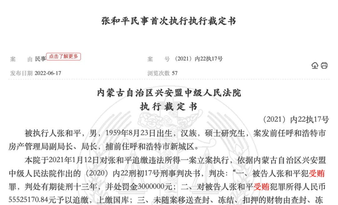 近日,裁决文书网公布了《张和平民事首次执行执行裁定书》。裁定书披露,被执行人张和平,1959年8月23日出生,案发前任呼和浩特市房产管理局副局长、局长,捕前住呼和浩特市新城区。本院于2021年1月12日对张和平追缴违法所得一案立案执行,依据兴安盟中级人民法院作出的(2020)内22刑初17号刑事判决书,判决:“一、被告人张和平犯受贿罪,判处有期徒刑十三年,并处罚金300万元;二、对被告人张和平受贿犯罪所得人民币55525170.84元予以追缴,上缴国库;三、未随案移送查封、冻结、扣押的财物由查封、冻结、扣押机关依法处理。”本院于2021年1月15日向乌兰浩特市监察委员会送达《关于执行张和平受贿罪一案的函》,2021年5月17日,乌兰浩特市纪律检查委员会向本院送达《关于“3.23”涉案款物说明》,说明张和平追缴违法所得一案中,纪委、监委扣押、查封的财产为人民币15539848.42元、美元10000元、丰田越野车一辆、房产四套(车辆、房产司法拍卖共计5183300元)。本院经网络查控和传统查控,发现张和平名下共有17个银行账户,其中仅6个账户内有余额。其余未发现有可供执行财产。2021年1月13日,本院对其名下账户进行冻结,2021年6月22日前陆续完成扣划。现已将其名下全部财产871876.2元执行到位,并以罚金形式上缴。2021年6月29日,本院对被执行人张和平采取限制高消费措施。本院认为,被执行人张和平无财产可供执行,应依法终结本次执行程序。据此,依照有关规定,裁定如下:终结兴安盟中级人民法院做出的(2020)内22刑初17号刑事判决书的本次执行程序。申请执行人发现被执行人有可供执行的财产,可再次申请执行。再次申请时间不受申请执行时效期限的限制。张和平于2020年3月24日宣布被查,其曾任呼和浩特市房产管理局副局长、局长,呼和浩特市新城区委副书记、区长、区委书记,中国国际贸易促进会委员会内蒙古自治区委员会副会长等职、经法院审理查明,2000年至2017年期间,张和平利用职务便利,在调整工作岗位、承揽工程、索要工程款等方面,为相关人员谋取利益,个人或伙同他人非法收受、索取31人的财物,共计折合人民币5552.517084万元,其中索要财物共计折合人民币3207.863037万元。案发前退还价值人民币787.6833万元的财物。据裁决文书网此前公布的《内蒙古贸促会原副会长张和平的一审判决书》披露,内蒙古“巨虎”邢云“背后的男人”董介荣,邢云亲妹妹邢云菊,原包商银行董事长李镇西,春华水务公司原董事长李建平都曾向张和平行贿。张和平还多次和邢燕菊合伙想办法索贿。其中,张和平仅通过收受、索取呼市原人大副主任邢燕菊、呼和浩特市荣联房地产有限责任公司法人董介荣、内蒙古名都房地产开发有限责任公司总经理邢某坤等三人的贿赂,就高达3900多万元。据披露,2002年10月,张和平在任呼和浩特市房管局局长期间,接受邢燕菊的请托,利用职务便利,将呼和浩特市房管局下属宜和公司所属的黑土凹村500亩土地使用权转让给郭某荣的伊克昭盟耕耘房地产公司,实则该宗土地使用权为邢燕菊控制。2003年6月,呼和浩特市建设“SARS”急救医院需征用该宗土地,征地事宜由呼和浩特市房管局具体负责。后经评估确认等环节,呼和浩特市政府以人民币2325万元征用该块土地。邢燕菊获得征地补偿后,张和平收受邢燕菊为感谢在土地转让及征地过程中提供的帮助而送予的人民币400万元。此外,2000年、2005年5月和2006年,张和平三次接受呼和浩特市水务局原局长、春华水务集团原董事长李建平请托,帮助李建平将单位管理住房公积金等多项资金存入呼和浩特市商业银行以方便贷款,帮助春华水务集团协调推进其承建的哈拉沁水库征地工作,为呼市水务局的东河治理项目及内蒙古长融公司开发水岸小镇项目的征拆工作提供帮助等,累计收受李建平给予的220万元贿赂。2011年3月,张和平在任中国国际贸易促进委员会内蒙古委员会副会长期间,接受包商银行董事长李镇西请托,利用职务便利,为包商银行争取在蒙古国开展金融业务提供帮助。同年4月,收受李镇西送予的10万港币。