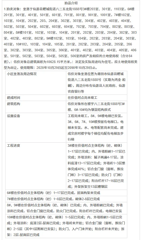 一、拍卖标的物:坐落于仙游县鲤城街道八二五北街1888号3#楼203室、301室、1103室,6#楼201室、301室、401室、501室、601室、701室、801室、901室、1001室,7#楼102室、103室、104室、202室、203、204室、302室、303室、304室、402室、403室、404室、502室、503室、504室、602室、603室、604室、702室、703室、704室、802室、803室、804室,8#楼101室、102室、103室、104室、201室、202室、203室、204室、302室、303室、402室、403室、802室,9#楼102室、103室、104室、202室、203室、204室、303室、403室,10#102、103室、104室、105室、201室、202室、203室、204室、205室、206室、302室、303室、304室、305室、306室、401室、402室、403室、404室、405室、406室、501室、502室、503室、504室、505室、506室的房产及相应的土地使用权(在建工程,合计84套):