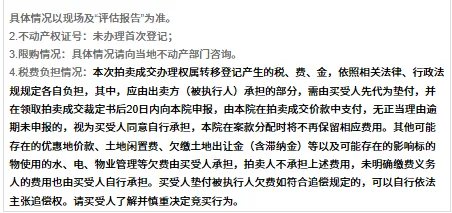 三、标的物以实物现状为准,法院不承担拍卖标的物瑕疵保证。竞买人决定参与竞买的,视为对拍卖财产完全了解,并接受拍卖财产一切已知和未知瑕疵。法院不安排统一看样,有意向竞买者务必在参与竞拍前自行前往房地产坐落处了解情况。