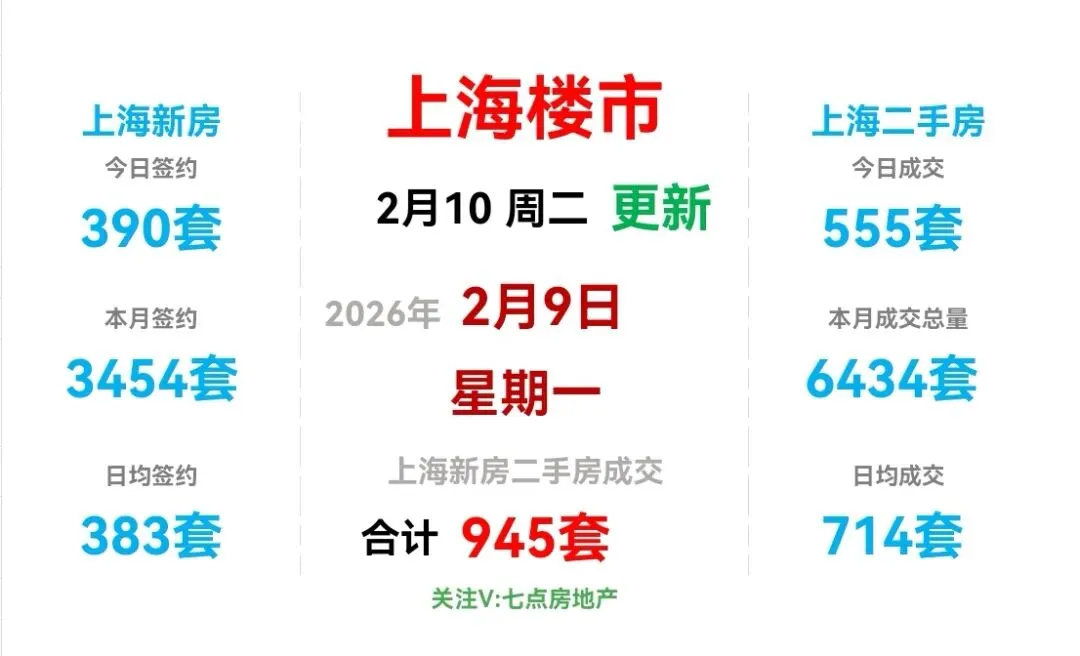 昨日(2月9日,周一),上海新房和上海二手房成交量合计945套。