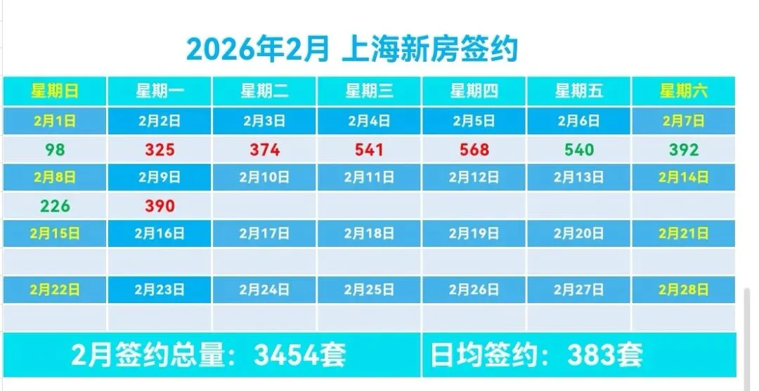 🏠2月上海新房总签约3454套,日均签约383套,本月签约总面积30.15万m²,套均面积88.48m²。