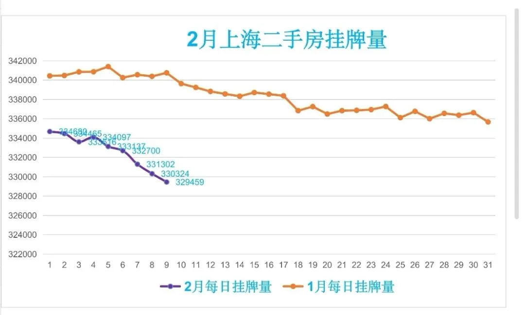 🏠昨日(2月9日,周一)挂牌329459笔,较前一日减少865笔,日均挂牌332642笔,约33.26万笔,挂牌与实际成交比465:1,去化周期约15.5个月。