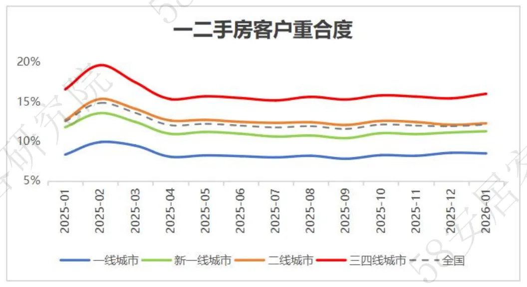 ¡一二市场重合度:2026年1月,重合度变化较小,微增0.2个百分点,整体上处于20%以下的低重合水平,一二手房之间客户分化显著且稳定。