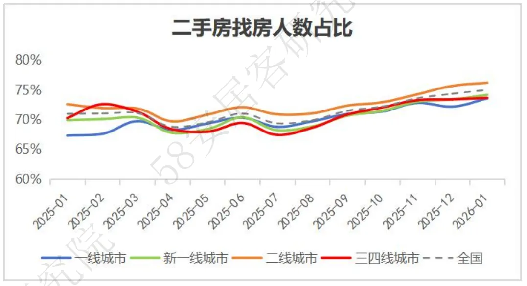 ¡二手房找房占比:2026年1月,全国二手房找房人数占比连续7个月回升,当前突破75%,各能级城市延续回升态势,二线领跑,一线增长显著。