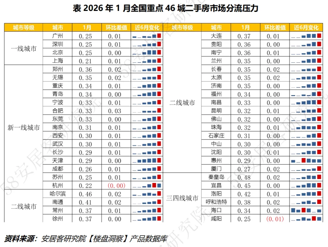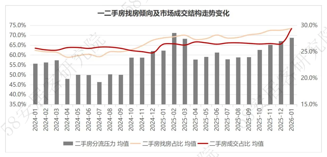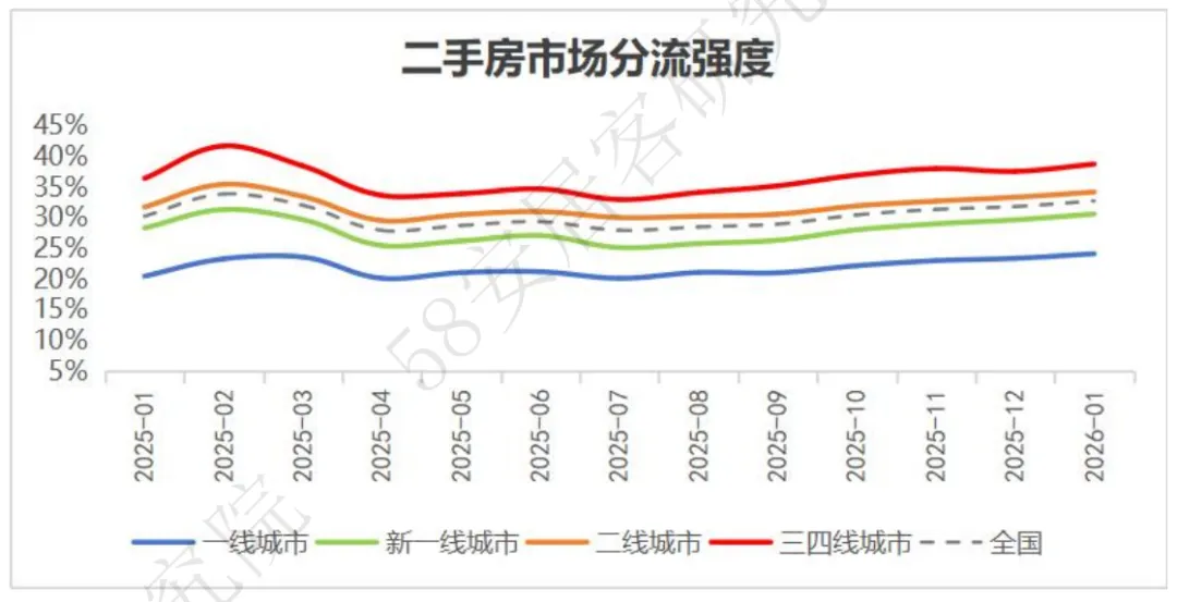 ¡二手房分流强度:2026年1月,分流强度连续7个月增强,全国二手房市场分流强度32.8,环比增加0.9个百分点,创2025年以来新高。