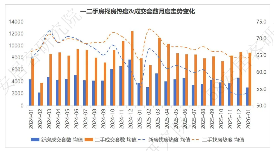 展望2026 年,楼市积极态势值得期待。春节前本是传统淡季,但找房热度却逆势上扬,这无疑释放出市场企稳修复的明确信号,二手房展现出的强劲韧性,更为市场稳定提供了有力支撑。当下,刚需客群向二手房聚集、改善客群偏好新房的分化格局愈发清晰。城市更新、政府收储、“好房子”建设推进等一系列政策落地实施,为市场发展注入动力,叠加找房热度对成交的传导作用,在多重积极因素共同作用下,预计 2026 年楼市有望保持温和修复态势,新房与二手房市场将逐步实现双向良性互动,行业发展长期向好的趋势也将更加稳固。