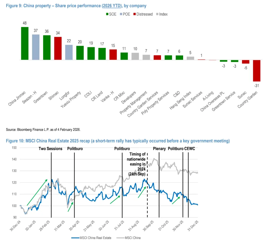 房地产板块在2月4日上涨5%(恒生指数:+0%),年初至今表现强劲(+16%,恒生指数+5%)。尽管有人可能将强势归因于上海近期的库存房收购(我们认为并不令人振奋),但我们认为驱动因素在于:(1)1月关于二手市场稳定的讨论增多;(2)对更强政策支持的预期上升,尤其是在《求是》文章之后。尽管1月部分市场指标确有小幅改善(如价格指数、二手成交),但我们认为现在断言市场已企稳仍为时过早(下文详述),且我们与开发商和中介的交流显示,1月的回升幅度仅属温和。百强房企1月销售依然疲弱,同比下降21%。不过,在2025年,即便投资者对政策支持的预期不高,该板块通常也会在关键政府会议前出现一波反弹(图10),因为投资者采取“以防万一”的策略(往往由市场传闻驱动)。因此,我们认为该板块可能维持强势(但波动较大)直至4月底(决策层会议)。我们的首选仍为华润置地、华润万象生活和中国金茂。这些标的年初至今表现良好(分别上涨17%、11%和48%;图9),但我们认为其基本面将继续支撑其跑赢。我们认为,在政策驱动的反弹中,龙湖提供最佳的风险回报比。