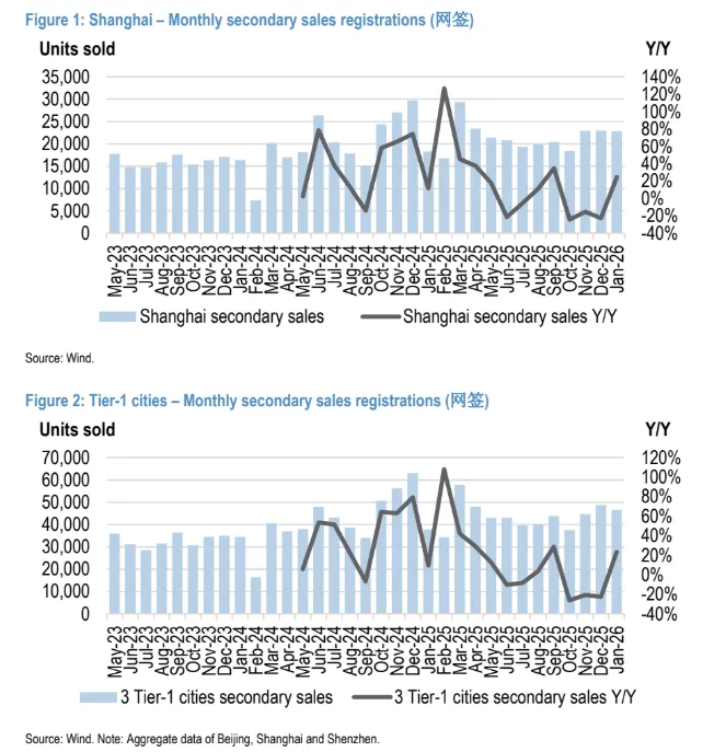 1)一线城市二手成交强劲:上海1月二手成交量创五年新高。尽管成交2.28万套、同比增长25%(图1)看似不错,但该数据基于网签,而网签数据在公共假期期间通常会异常偏低。由于去年春节在1月(而今年春节在2月),对比基数并非同口径。若对比去年春节假期扰动前的月内数据,同比增速将为+2%。我们并不因二手成交量本身而悲观(我们预计全年增速大致持平),但二手成交自2025年上半年以来已趋于稳定(图4)(尽管2025年四季度因高基数导致同比看起来偏弱),因此这并非新现象。将二手成交数据扩展至北京和深圳(图2)也可看到类似趋势。