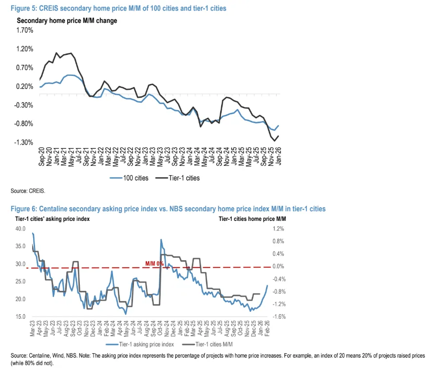 2)房价环比降幅收窄:据中指院(CREIS),100城二手住宅价格环比降幅从12月的-0.97%收窄至1月的-0.85%(仅一线城市:从12月的-1.26%收窄至1月的-1.13%)(图5)。中原(Centaline)的二手挂牌价指数也显示出改善趋势(图6),自低点回升。但中原解释称,1月回升部分源于季节性因素(通常春节前更强)。我们认为改善幅度相当温和,仍需再观察数月才能下结论。毕竟,这种温和改善也可能是对12月多项政策措施(如增值税下调、北京放松政策)的短期反应。
