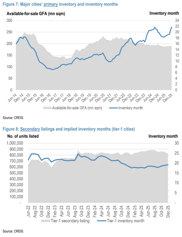 3)挂牌量下降:截至12月,一线城市二手房挂牌量环比下降3.8%(较峰值低7%)(图8)。尽管看起来有所改善,但挂牌的绝对数量仍处于高位。推算的去化月数仍然偏高,为19个月(新房市场的去化月数更高,为22个月——图7)。在此背景下,二手房挂牌减少确实可能缓解房价压力,我们也预计环比降幅会略有收窄。然而,我们认为房价转正仍需时间(通常当去化月数降至12个月以下时才会出现)。