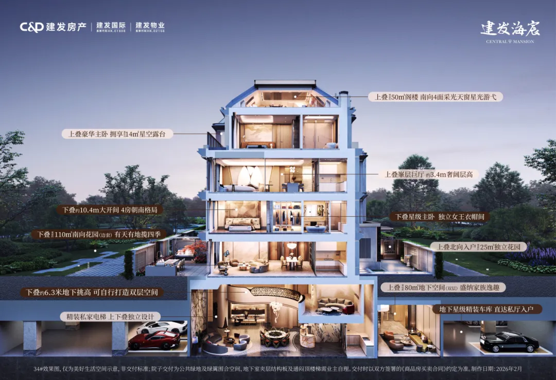 建发海宸34#效果图仅为美好生活空间示意,非交付标准;院子交付为公共绿地及绿篱围合空间,地下室夹层结构板及通闷顶楼梯需业主自理。交付时以双方签署的《商品房买卖合同》约定为准