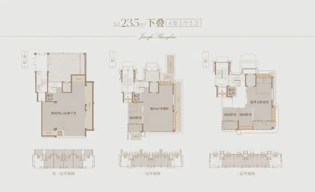 建面约228㎡下叠户型,以奢阔尺度与灵动格局,诠释世家大宅的气度与品位。首层南向建面约110㎡私家花园(边厅),可设置户外沙发、烧烤台与篝火区,营造星空下的会客厅;二层主打舒适卧室层,三间卧室均拥有宽绰尺度;地下空间更显匠心,约6.3米的挑高可轻松拓展为双层使用,轻松延展建面超200㎡的灵动多功能区。