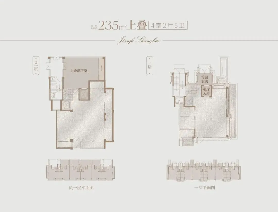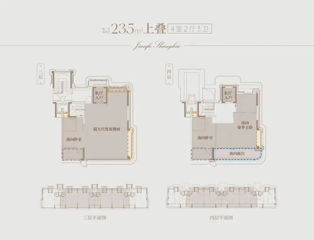 建面约235㎡上叠,则为三代同堂的家庭提供了解决方案。北向首层私享建面约25㎡的入户花园;上叠三层以无界厅堂为核心,约10.4米开间让光线无遮挡漫入;上叠四层三间卧室均朝南,实现全明采光;与市场常规上叠不同,建发海宸上叠拥有建面约80㎡地下空间(双层)与建面约50㎡私家阁楼,真正实现“空间超越面积”的价值升华。