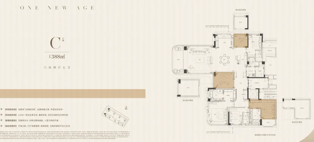 建面约388平方米的户型现配置为六房格局,拥有约100平方米的宽阔厅堂,并创新性地规划了多个阳台,其中部分被设计为茶室或书房,增强了空间层次与视野环绕感。