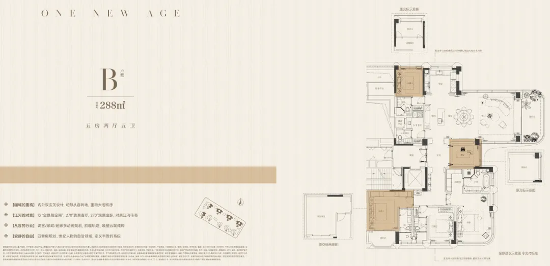 建面约288平方米户型则提供五间套房,确保每间卧室均配备独立卫浴,主卧空间宽敞且预留灵活变动可能;