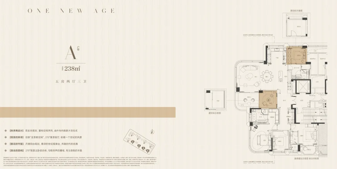 而建面约238平方米户型同样以五房布局呈现,配合两梯两户与独立电梯厅,通过无柱设计和开阔方厅最大化视觉体验,书房连通阳台,可作为入户茶室使用。