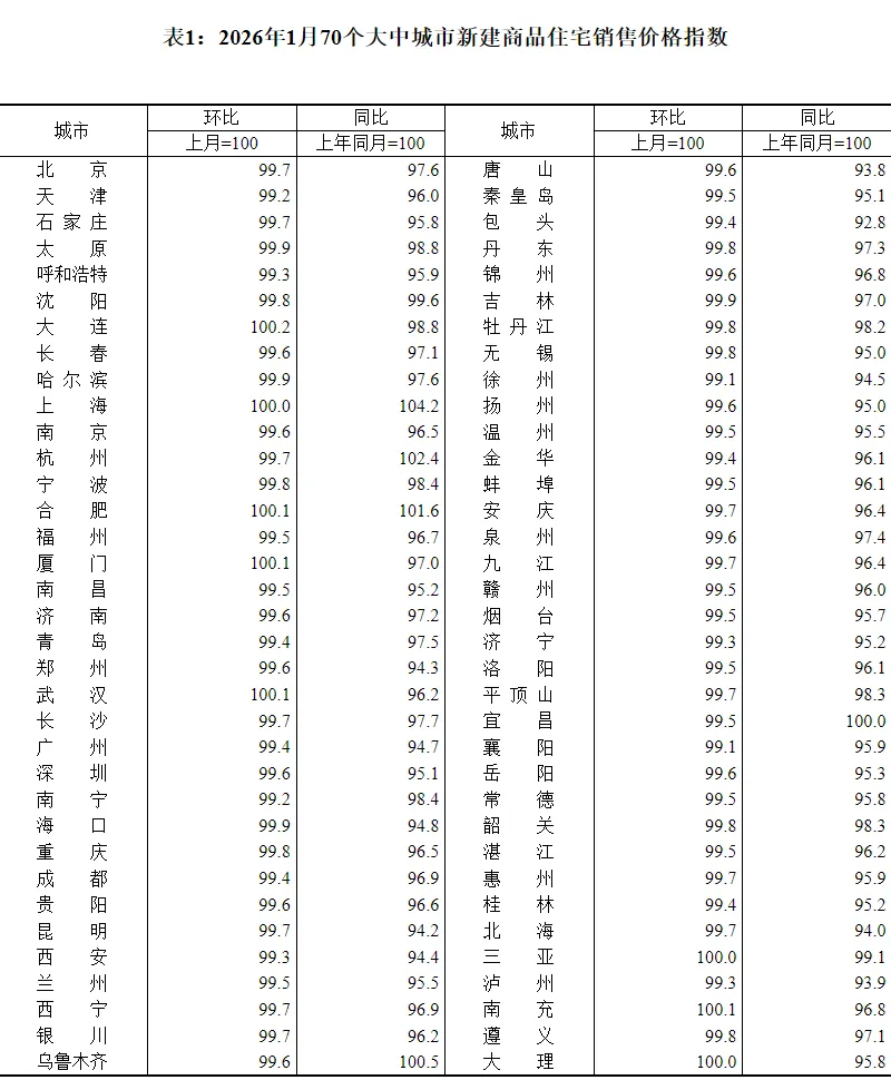 2月13日,国家统计局发布2026年1月70个大中城市商品住宅销售价格指数,数据显示:全国楼市延续调整态势,但环比降幅总体收窄,尤其是一线城市二手房价格跌幅收窄显著,市场正释放“止跌回稳”的积极信号!