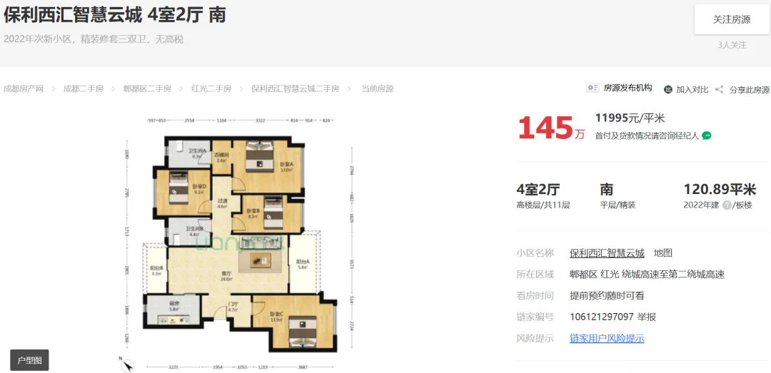 2026年02月12日,据市场端消息:成都郫都红光,保利西汇智慧云城建面121平套四报价145万;目前房东心里价在145万愿意出售。