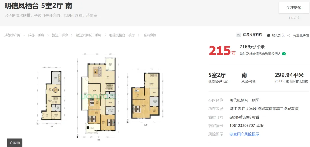 2026年02月13日,据市场端消息:成都温江大学城,明信凤栖台建面300平套五报价215万;目前房东心里价在215万愿意出售。