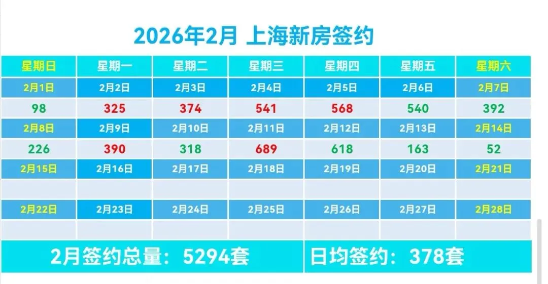 🏠2月上海新房总签约5294套,日均签约378套,本月签约总面积42.81万m²,套均面积85.32m²。
