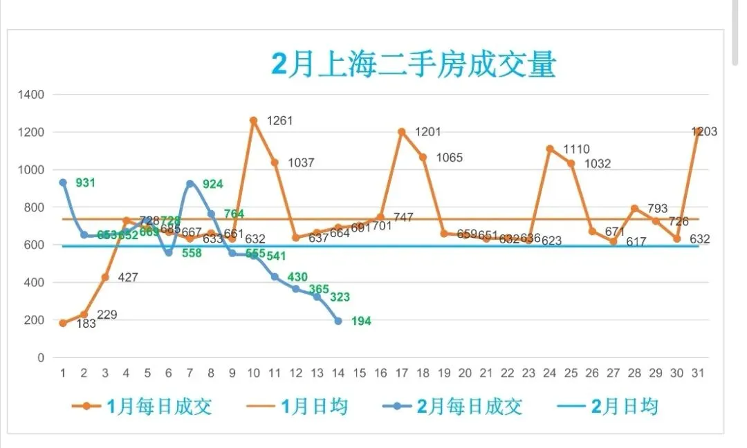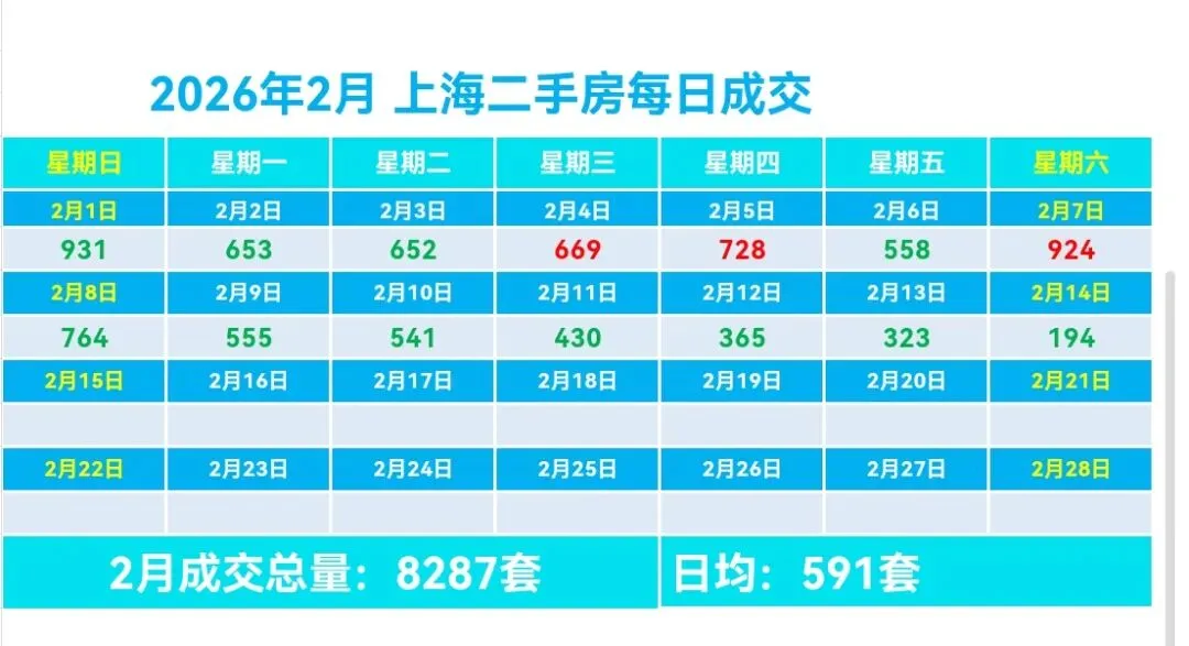 🏡2月,上海二手房成交量累计8287套,日均成交591套,较上个月日均减少145套(降幅19.7%)。