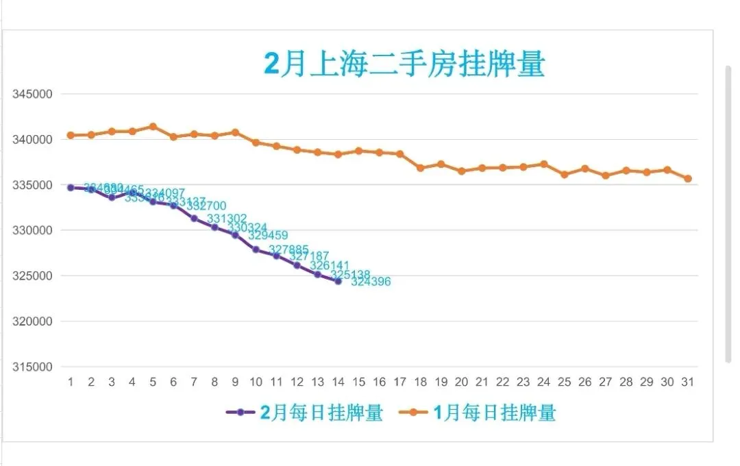 🏠昨日(2月14日,周六)挂牌324396笔,较前一日减少742笔,日均挂牌330323笔,约33.03万笔,挂牌与实际成交比558:1,去化周期约18.6个月。