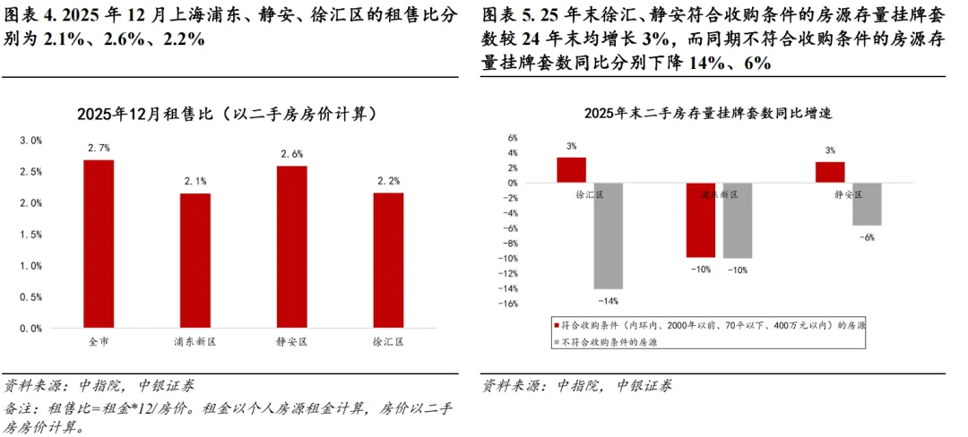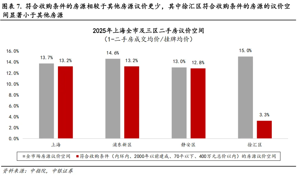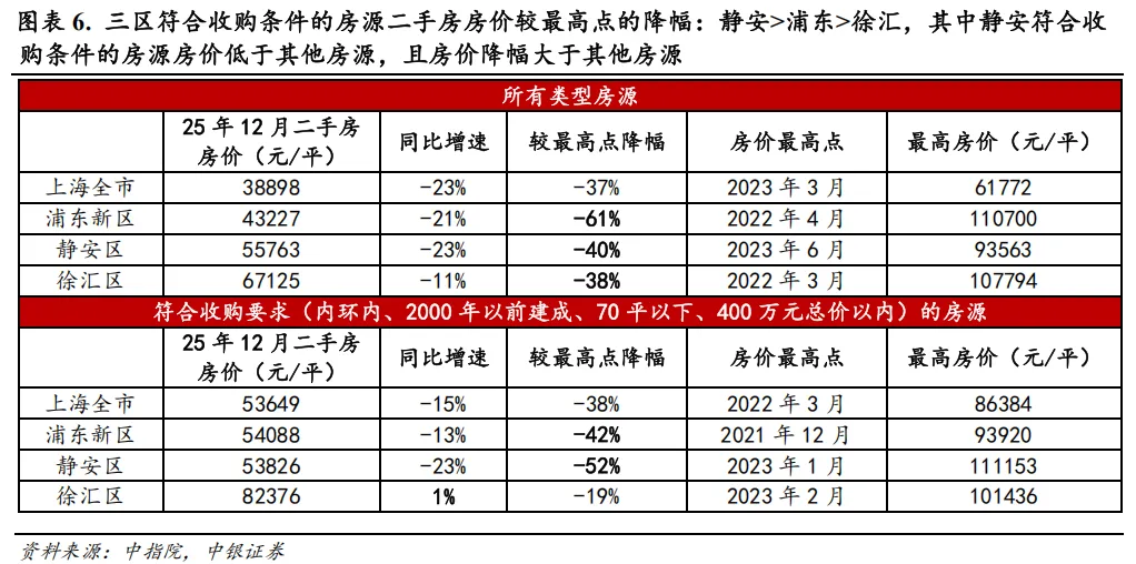 从这三个区各自的二手房成交价格来看,较最高点以来的降幅都超过全市平均,某种程度上说,确实需要稳住预期。不过符合收购条件的房源中,徐汇区的价格跌幅最小。根据中指院,25年12月上海二手房房价3.9万元/平,同比下降23%,较最高点(23年3月)下降37%;浦东新区4.3万元/平,同比下降21%,较最高点(22年4月)下降61%;静安区5.6万元/平,同比下降23%,较最高点(23年6月)下降40%;徐汇区6.7万元/平,同比下降11%,较最高点(22年3月)下降38%。三区符合收购条件的房源二手房房价较最高点的降幅:静安>浦东>徐汇,其中静安符合收购条件的房源房价低于其他房源,且房价降幅大于其他房源。25年12月上海符合收购条件(内环内、70平以下、400万总价以内、2000年以前建成)的二手房房价为5.4万元/平,同比下降15%,较最高点(22年3月:8.6万元/平)下降38%。横向比较符合收购条件的房源价格:浦东新区平均房价5.4万元/平,同比下降13%,较最高点(21年12月:9.4万元/平)下降42%;静安区平均房价5.4万元/平,同比下降23%,较最高点(23年1月:11.1万元/平)下降52%;徐汇区平均房价8.2万元/平,同比增长1%,较最高点(23年2月:10.1万元/平)下降19%。