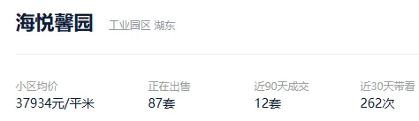 根据贝壳信息显示,海悦馨园目前87套挂牌出售,挂牌均价37934元/平。