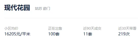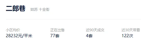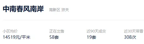 根据贝壳数据显示,今年以来,该社区成交了4套二手住房,套均成交面积97.25平,平均挂牌单套总价154万元,挂牌单价15784元/平,平均成交周期259天。