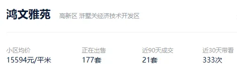 根据贝壳数据显示,今年以来,该社区成交了15套二手住房,套均成交面积73.98平,平均挂牌单套总价116万元,挂牌单价15634元/平,平均成交周期236天。