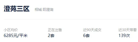 根据贝壳信息显示,澄苑三区目前2套挂牌出售,挂牌均价6285元/平。