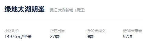根据贝壳信息显示,绿地太湖朗峯目前27套挂牌出售,挂牌均价14976元/平。