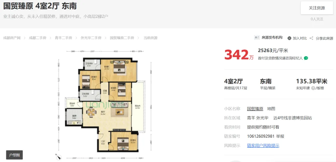 2026年02月13日,据市场端消息:成都青羊非遗,国贸臻原建面135平套四报价342万;目前房东心里价在342万愿意出售。