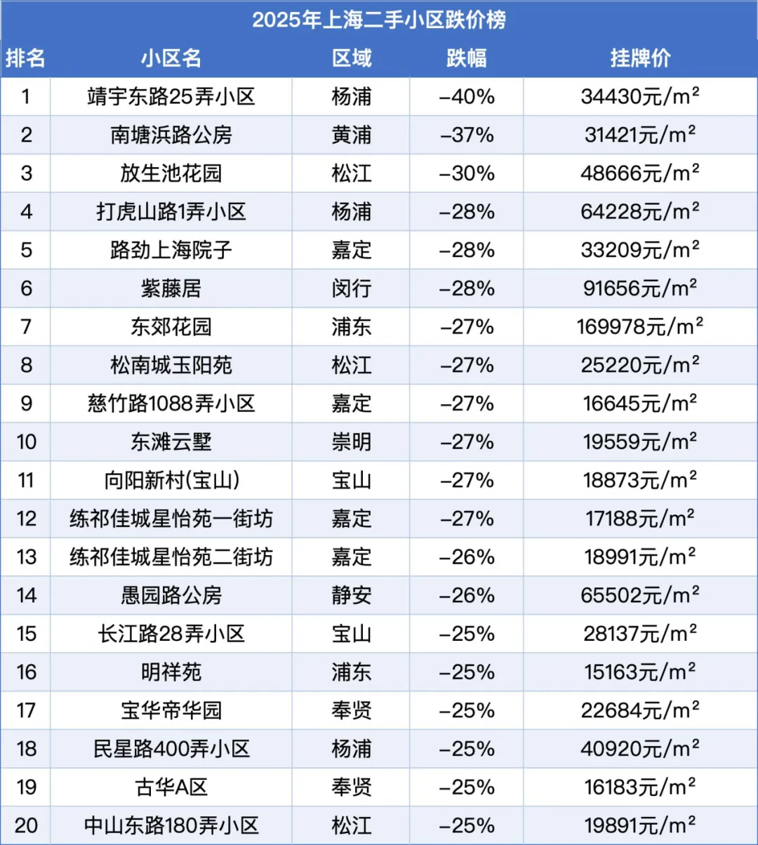 杨浦靖宇东路25弄小区以40%的跌幅居首,挂牌价跌至3.44万/㎡;黄浦南塘浜路公房跌37%,昔日核心区老房光环不再;松江放生池花园跌30%,远郊别墅承压!