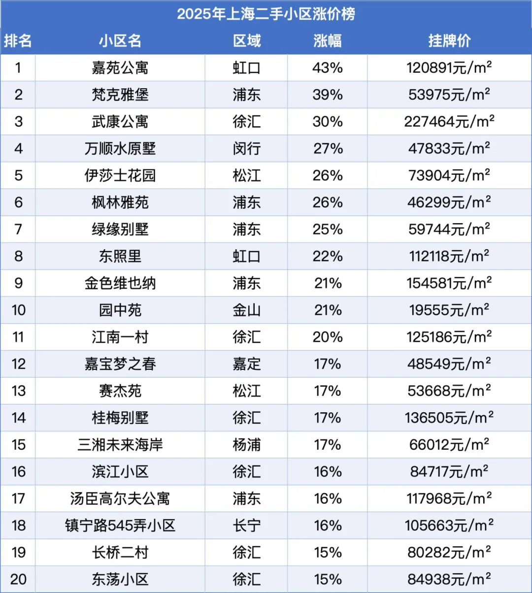 虹口嘉苑公寓以43%的涨幅登顶全市,挂牌价达12.09万/㎡;浦东梵克雅堡涨39%紧随其后,挂牌价5.40万/㎡;徐汇武康公寓涨30%,挂牌价高达22.75万/㎡,刷新板块天花板。