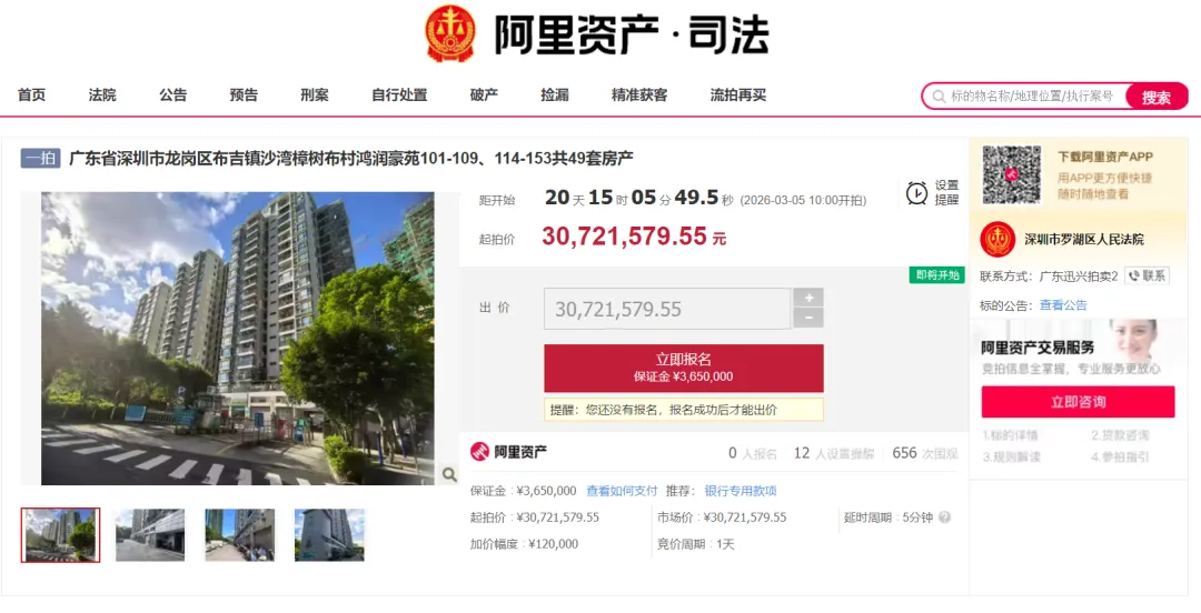 2026年3月5日10:00-2026年3月6日10:00,深圳市罗湖区人民法院将在阿里资产平台对深圳龙岗布吉镇的49房产进行整体公开拍卖,竞价周期1天,延时周期5分钟。