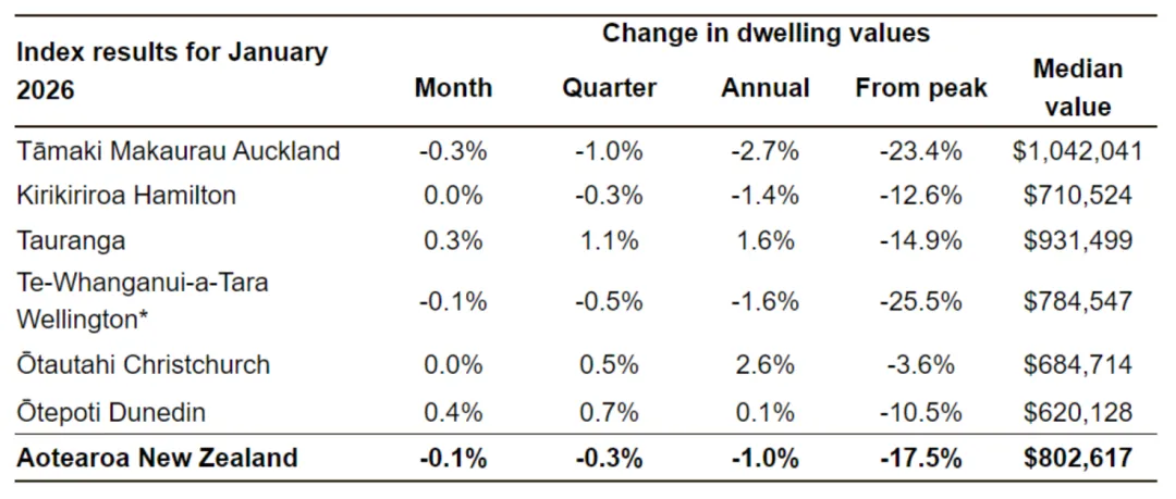 Cotality最新发布的房市报告显示,1月,新西兰全国房价小幅下跌了0.1%,延续了2025年整体趋于平稳的走势,也为2026年开局定下基调。