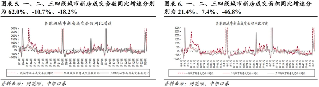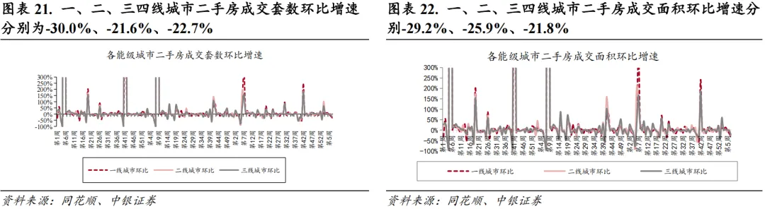 新房成交面积环比降幅扩大,同比由正转负。40个城市新房成交面积149.8万平,环比下降9.5%,同比下降5.5%,同比增速较上周下降209.8个百分点。一、二、三四线城市新房成交面积环比增速分别为-20.1%、-2.6%、-11.3%,同比增速分别为21.4%、7.4%、-46.8%,一、二线城市同比涨幅较上周收窄342.8、279.1个百分点,三四线城市同比增速较上周下降78.2个百分点。