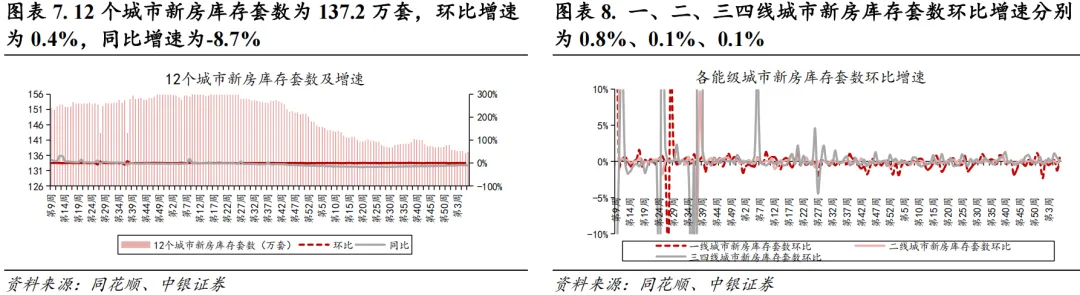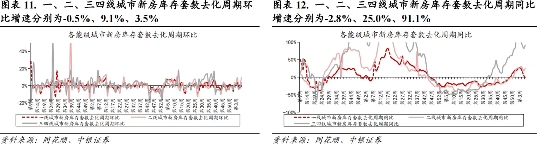 新房库存面积环比由负转正、同比降幅收窄;去化周期同环比均上升。12个城市新房库存面积11261万平,环比增速为0.2%,同比增速为-4.9%;去化周期17.8个月,环比上升0.5个月,同比上升4.2个月。一、二、三四线城市新房库存面积去化周期分别为17.7、15.4、66.5个月,一线城市环比下降0.2个月,二、三四线城市环比分别上升1.1、2.2个月,一、二、三四线城市同比分别上升2.7、4.8、31.1个月。