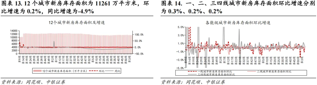 12个城市新房库存面积为11261万平方米,环比增速为0.2%,同比增速为-4.9%。一、二、三四线城市新房库存面积分别为5862、4816、583万平米,一、二、三四线城市环比增速分别为0.3%、0.2%、0.2%,同比增速分别为-7.0%、-3.8%、6.4%。