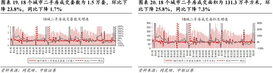 本周(第7周:2月7日-2月13日)相比于上周,新房成交面积环比降幅扩大、同比由正转负;二手房成交面积环比降幅扩大、同比由正转负;新房库存面积环比由负转正、同比降幅收窄;一线城市新房库存面积去化周期环比下降、二、三四线城市环比上升,一、二、三四线城市新房库存面积去化周期同比均上升。