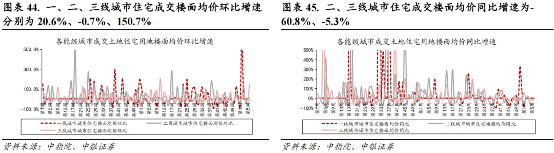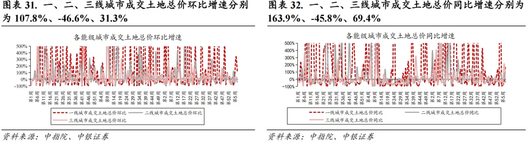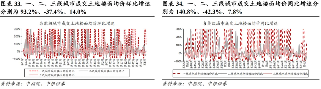 从不同城市能级的住宅类土地市场情况来看,本周一、二、三线土地建筑面积分别为12.4、36.0、90.2万平米,一、二、三线城市环比增速分别为-20.8%、-55.6%、-40.1%,二、三线城市同比增速分别为353.5%、212.9%;一、二、三线城市住宅类成交土地总价分别为29.5、19.3、43.0亿元,一、二、三线城市环比增速分别为-4.5%、-55.9%、50.1%,二、三线城市同比增速分别为77.6%、196.4%;一、二、三线城市住宅类平均楼面价分别为23826、5370、4767元/平,一、二、三线城市环比增速分别为20.6%、-0.7%、150.7%,二、三线城市同比增速分别为-60.8%、-5.3%;一、二、三线城市平均住宅类成交土地溢价率分别为0.0%、7.9%、0.0%,二线城市环比下降3.7个百分点、三线城市环比下降0.2个百分点,一线城市同比增速不变、二线城市同比下降79.6个百分点、三线城市同比下降7.4个百分点。