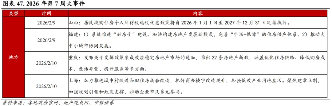本文来自中银证券研究部于2026年2月16日发布的报告《新房、二手房成交环比降幅扩大、同比由正转负;重庆推出地产新政稳定房地产市场——房地产行业第7周周报(2026年2月7日-2026年2月13日)》。欲了解详细全文内容,请阅读报告原文。夏亦丰S1300521070005