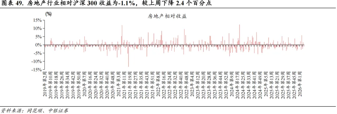 板块相对收益有所下降。房地产行业绝对收益为-0.7%,较上周下降0.7pct,房地产行业相对收益(相对沪深300)为-1.1%,较上周下降2.4pct。房地产板块PE为26.89X,较上周下降0.30X。